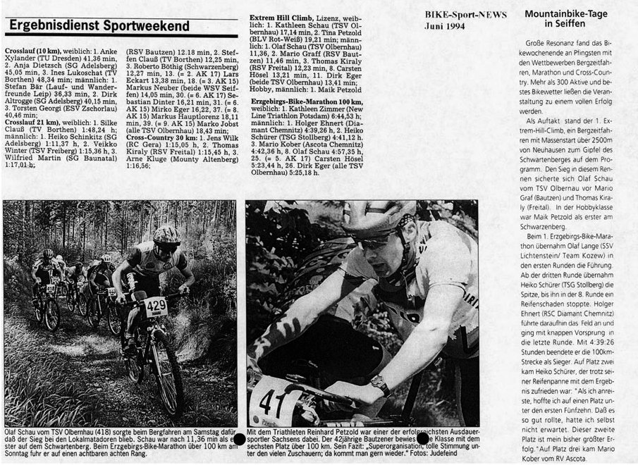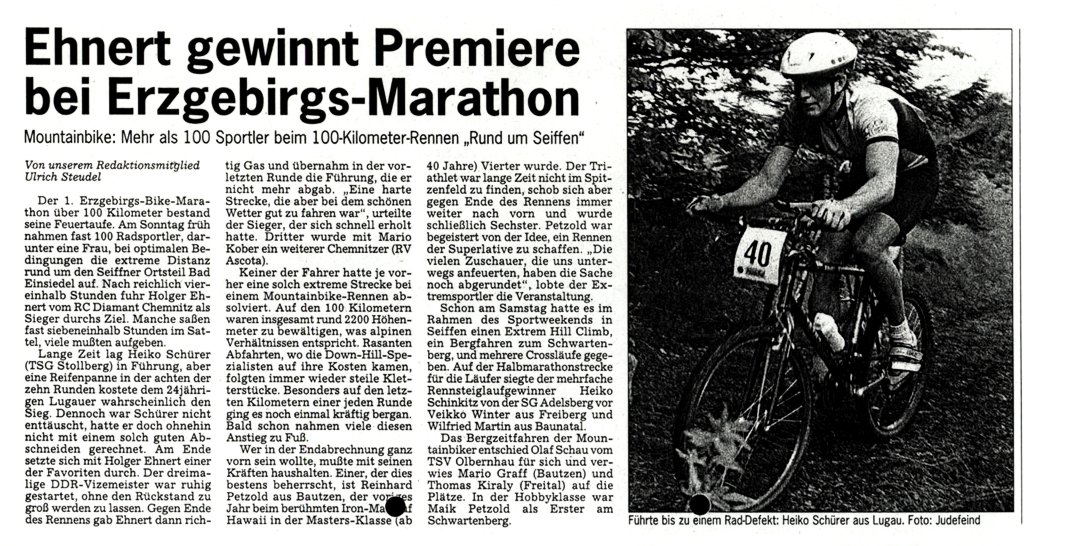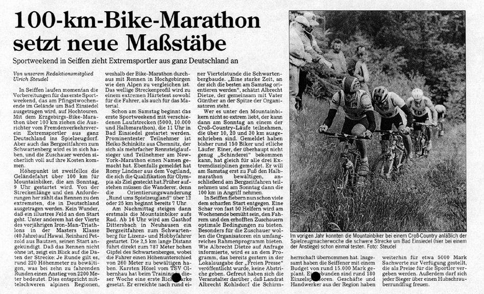 Eingeleitet wurde das Wochenende mit einem Bergzeitfahren hinauf zum Schwartenberg über 3 km. In der Hobby-Klasse siegt der spätere Weltklasse- Triathlet Maik Petzold. Am Sonntag ging es über 10 x 10 km, es gewinnt der dreimalige DDR-Vizemeister Holger Ehnert aus Chemnitz. In der Ergebnisliste finden sich als 16. Rainer Jäpel (Globetrotter), 26. Dirk Eger (Pulsschlag) und als 50. Andre Koch (Biker + Boarder), welche die Veranstaltung dauerhaft unterstützen werden.