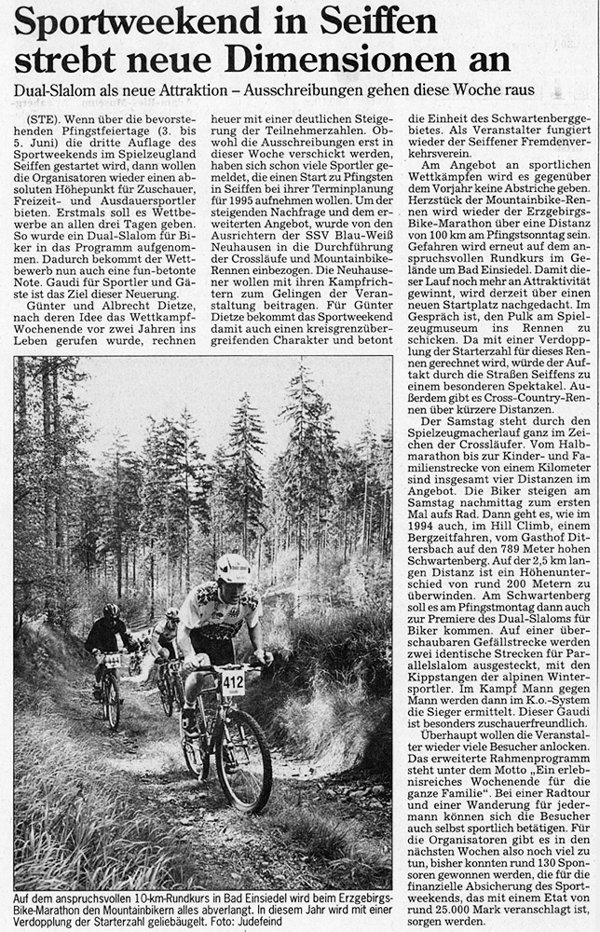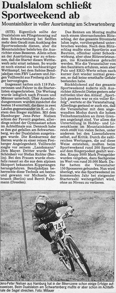 Hill-Climb, Marathon und Dual-Slalom sollten es schon sein. Auf tiefem Geläuf gewinnt Jens Olomek aus Chemnitz vor dem Vorjahressieger Holger Ehnert und dem damals 17jährigen Cross-Country-Sachsenmeister Clemens Mühsinger aus Dresden. Auch Clemens wird x-mal beim EBM am Start sein. Zum Dual-Slalom am Schwartenberg tritt “Nutella-Mann” Nils Peter Jensen an, wurde aber seinerzeit von einem Local bezwungen. In Erinnerung bleibt der Blitzeinschlag “aus heiterem Himmel” auf dem Schwartenberg, bei dem glücklicherweise niemand zu Schaden kam.