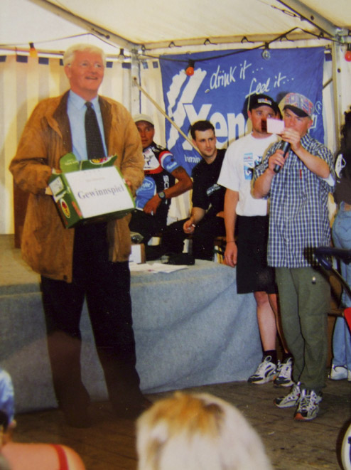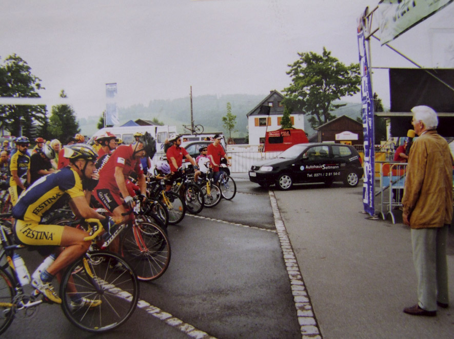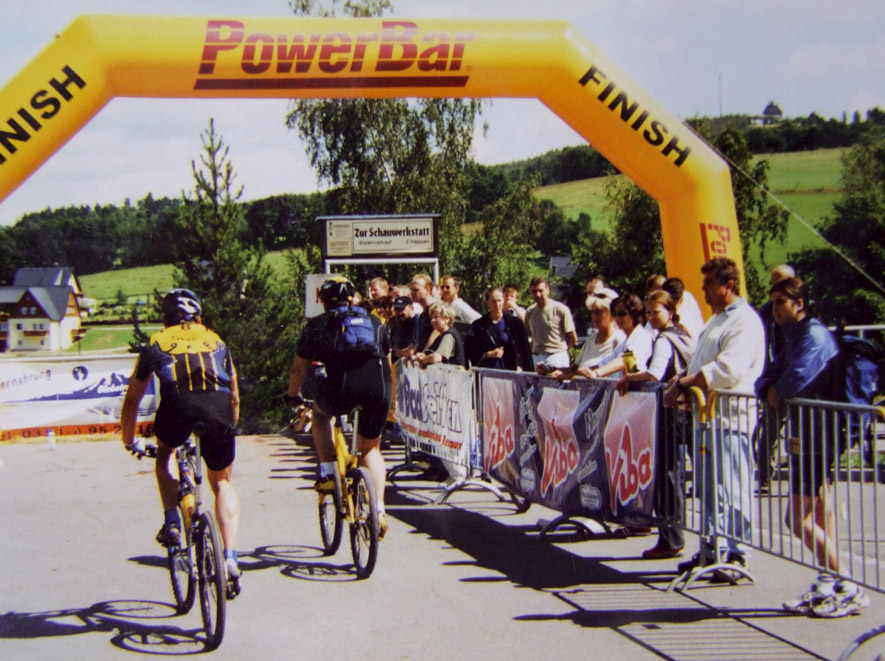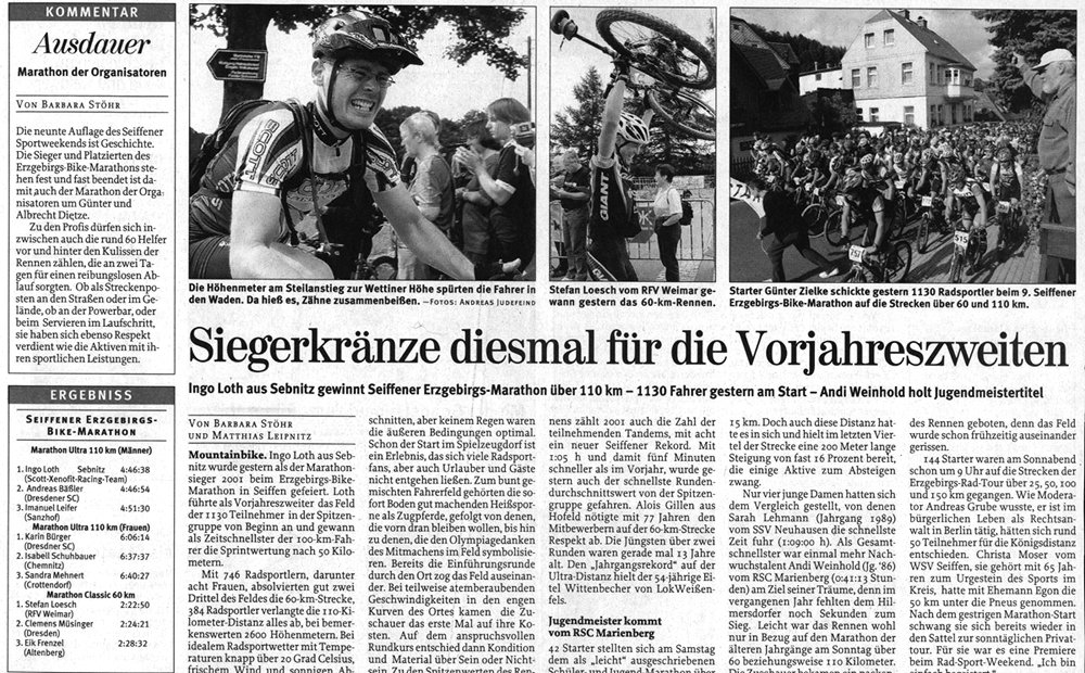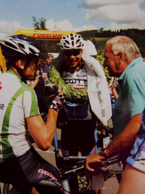 Austrainiert bis in die Haarspitzen war er angetreten und hatte zu keinem Zeitpunkt des Rennens Zweifel an seinem Sieg aufkommen lassen. Wir haben uns sehr für ihn gefreut. Bei den Damen gewinnt Karin Bürger aus Dresden. In der Presse ist erstmals vom “Mekka des Radsports” die Rede. „2001 – Sieg beim EBM und einer meiner schönsten sportlichen Erfolge!“